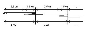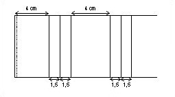 4 cm nach der letzten Markierung kommen wieder 3 Striche im Abstand von 1,5 cm. Also immer: 4 - 1,5 - 1,5 - 4 - 1,5 - 1,5 - 4 - 1,5 - 1,5.... Am Ende sollten noch etwa 4 cm übrig bleiben. |
